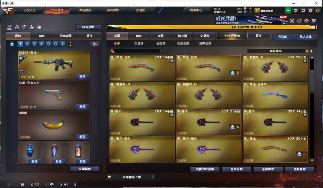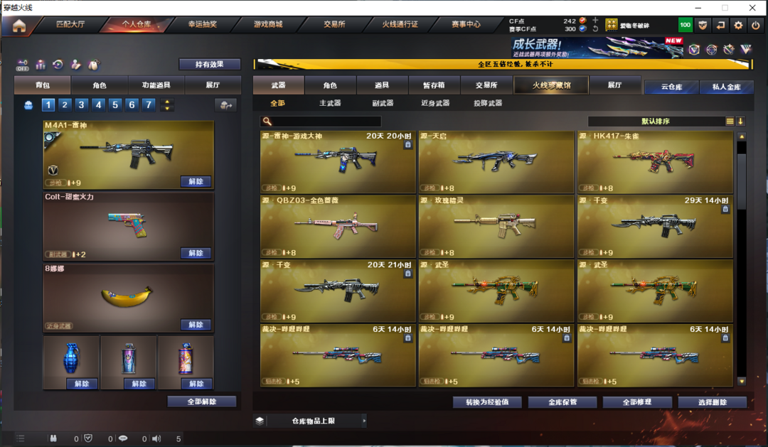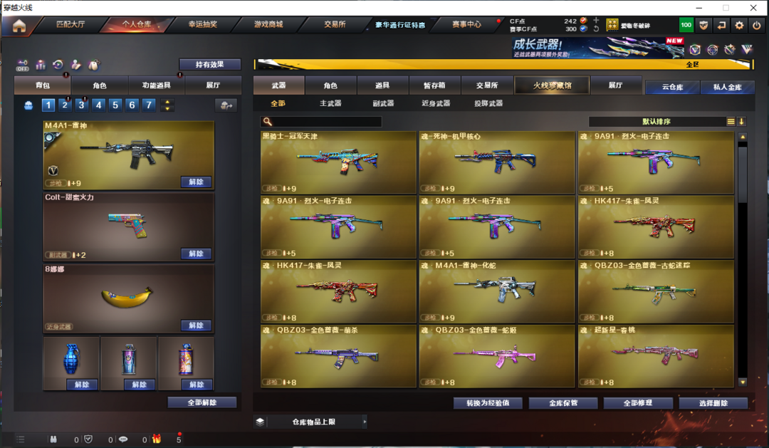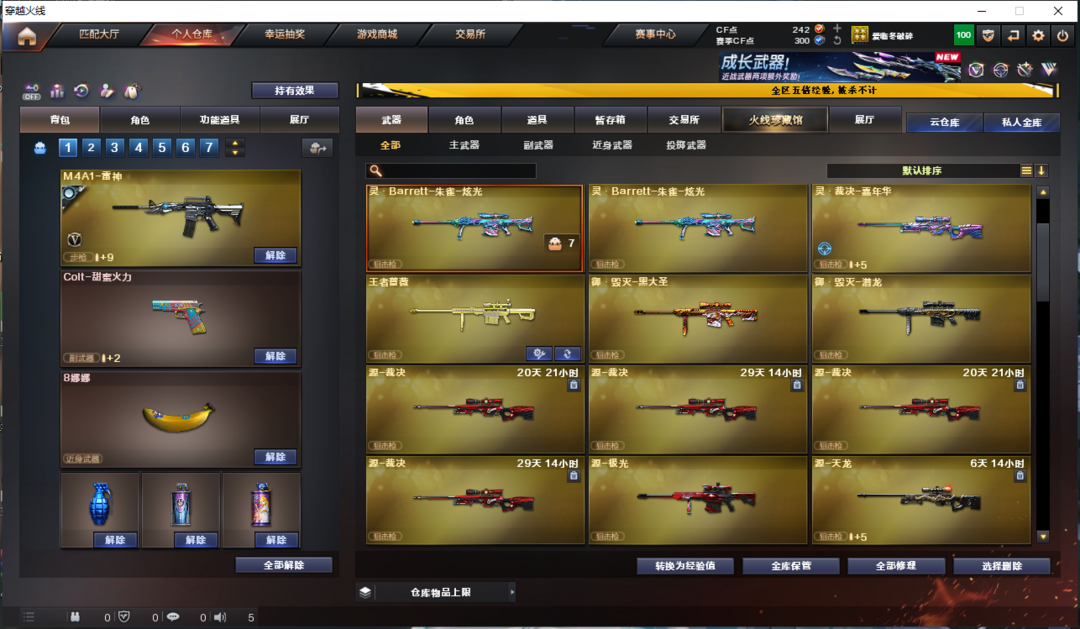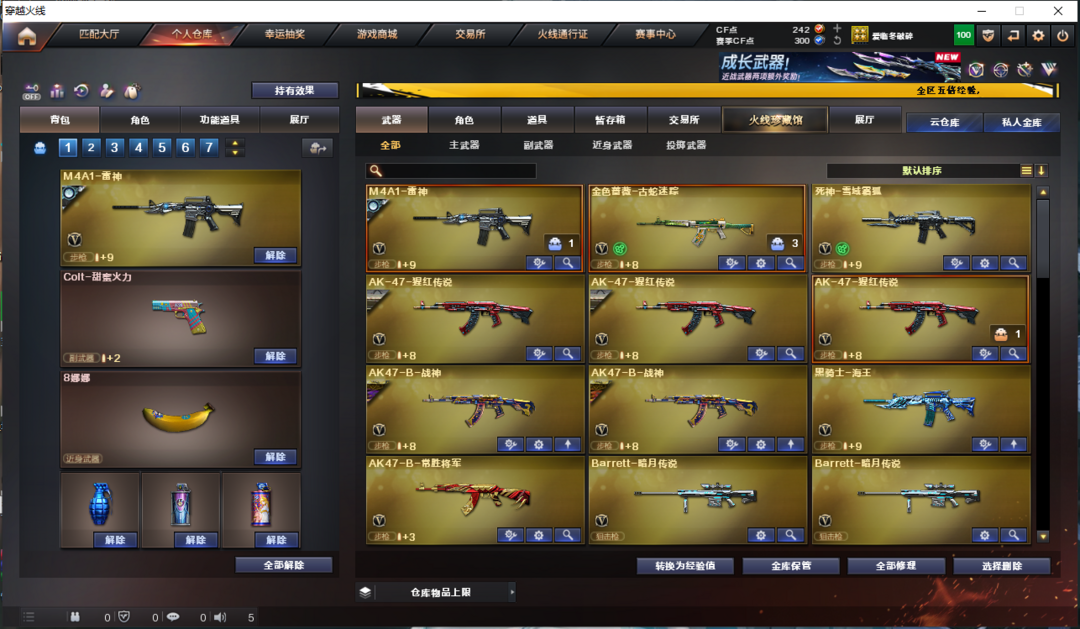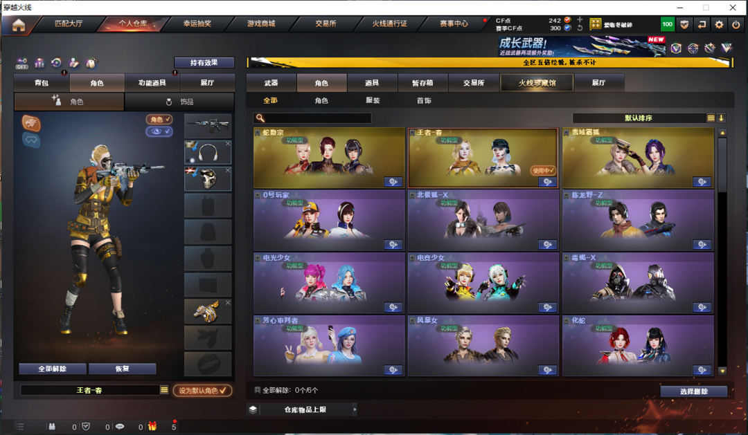 装备描述:王者武器:王者蔷薇 英雄武器:M4A1-黑骑士;Barrett-极光;屠龙;AK47-B-常胜将军;AK-47-猩红传说;Barrett-暗月传说;AK47-B-战神;M4A1-雷神;黑骑士-海王 角色:猎狐者;刀锋;潘多拉;幻影;复仇者;夜玫瑰;威锋;猎狐者-英特尔;精英部队;救世主-X;蜀雪;雪莉杨;北极狐-X;陈龙野-Z;艾比;王者春;妲己;圣诞潘多拉-X;代号:翼;猎狐者-Y;芳心审判者;社长刀锋;潘多拉-锋芒精英;斯沃特-锋芒精英;兔囡囡;毒蝎-X;超能特工;风暴女;木兰;猎狐者-追月;维纳斯;电竞少女;沃特X;电光少女;狐妖儿;狐妖儿;秦师;夜玫瑰-宠粉;0号玩家;化蛇;智影;疾风