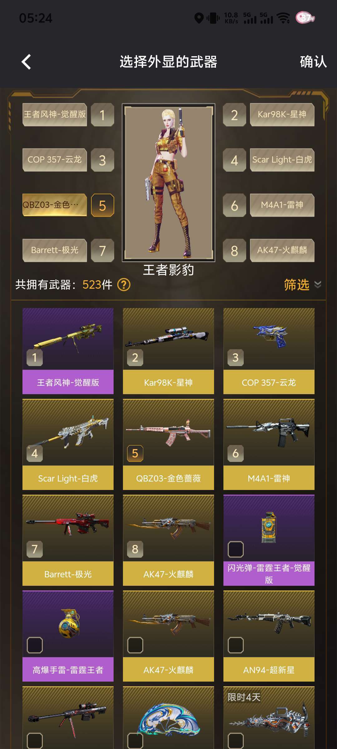 47v爆破全装☞王者风神(觉醒版)☞98K(带音效卡)☞白虎☞QBZ03☞极光(带音效卡)