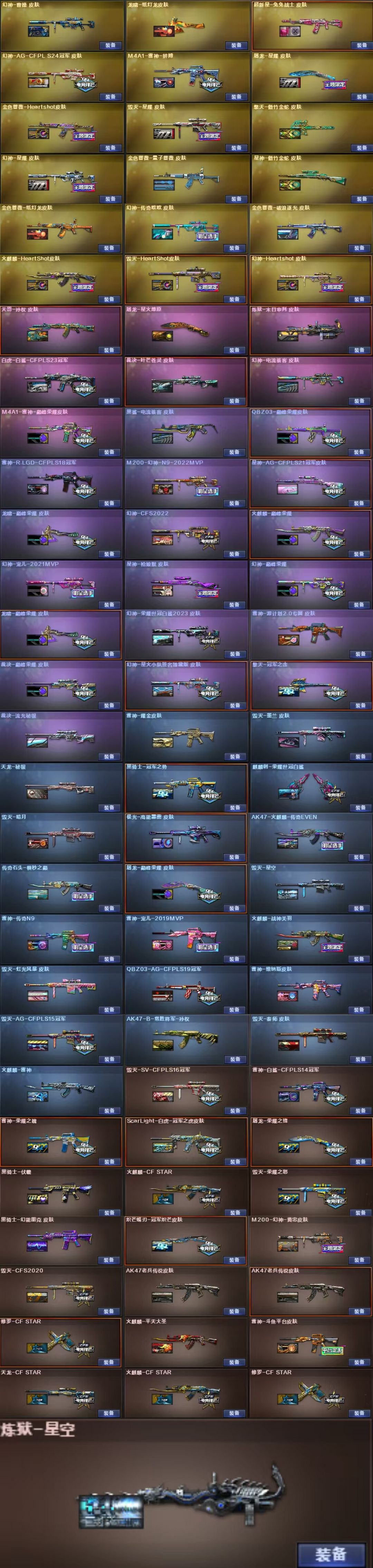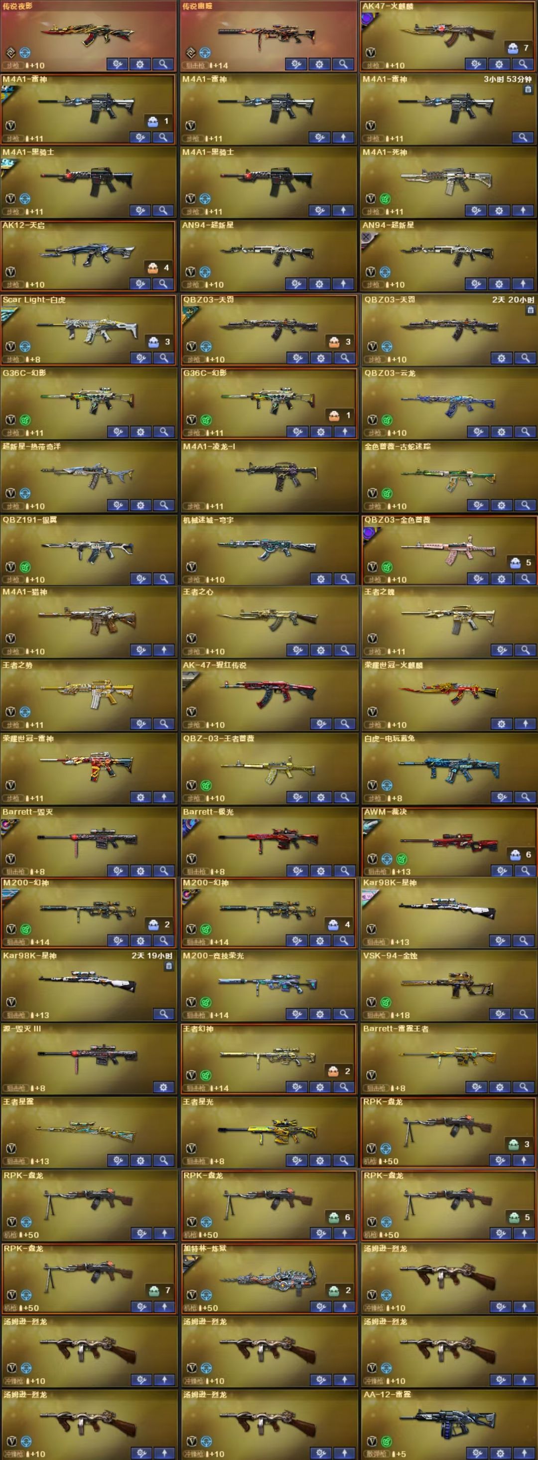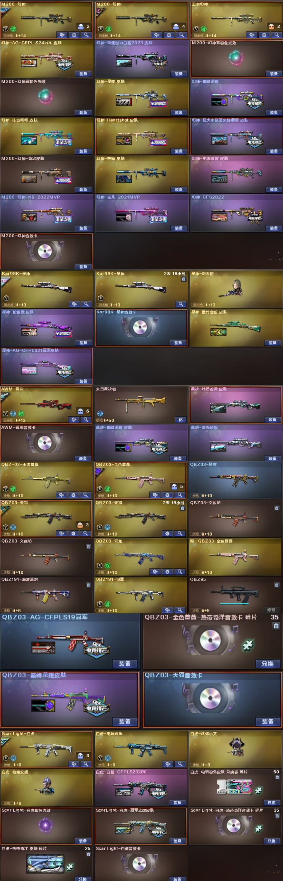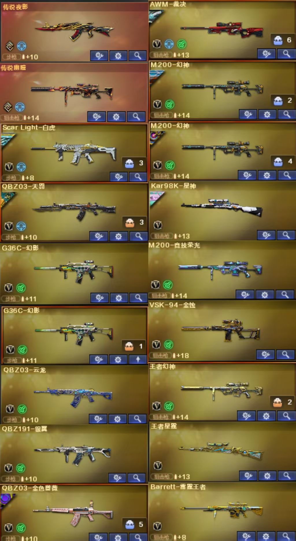 装备描述:王者武器:Barrett-雷霆王者-觉醒版;王者星光;王者之心-觉醒版;王者破空枪刃;COP 357-雷霆王者-觉醒版;QBZ-03-王者蔷薇-觉醒版;王者幻神-觉醒版;王者之魄-觉醒版;闪光弹-雷霆王者-觉醒版;高爆手雷-雷霆王者;雷霆王者之锋-觉醒版;烟雾弹-雷霆王者-觉醒版;王者之势-觉醒版;炫金千变;王者星霆;王者岩刺;炫金无影;王者之锋-觉醒版 英雄武器:Barrett-碧霄极光;麒麟刺;Kar98K-星神;QBZ03-天罚;M4A1-雷神;烟雾弹-玄豹;龙啸-烈火龙威;机械迷城-穹宇;M4A1-猎神;龙啸;屠龙;沙鹰-天神;AN94-超新星;G36C-幻影;柯尔特-荣耀世冠白鲨2023;M200-幻神;汤姆逊-烈龙;传说夜影;加特林-炼狱;RPK-盘龙;Kar98K-星神;传说幽瞳;M4A1-雷神;M4A1-黑骑士;柯尔特-无冕之王;荣耀世冠-雷神;荣耀世冠-火麒麟;荣耀世冠-柯尔特;AA-12-雷霆;M4A1-死神;擎天;AK12-天启;QBZ03-天罚;QBZ03-金色蔷薇;炽芒蝶刃;COP 357-云龙;高爆手雷-云龙;云龙扇;闪光弹-云龙;QBZ03-云龙;烟雾弹-