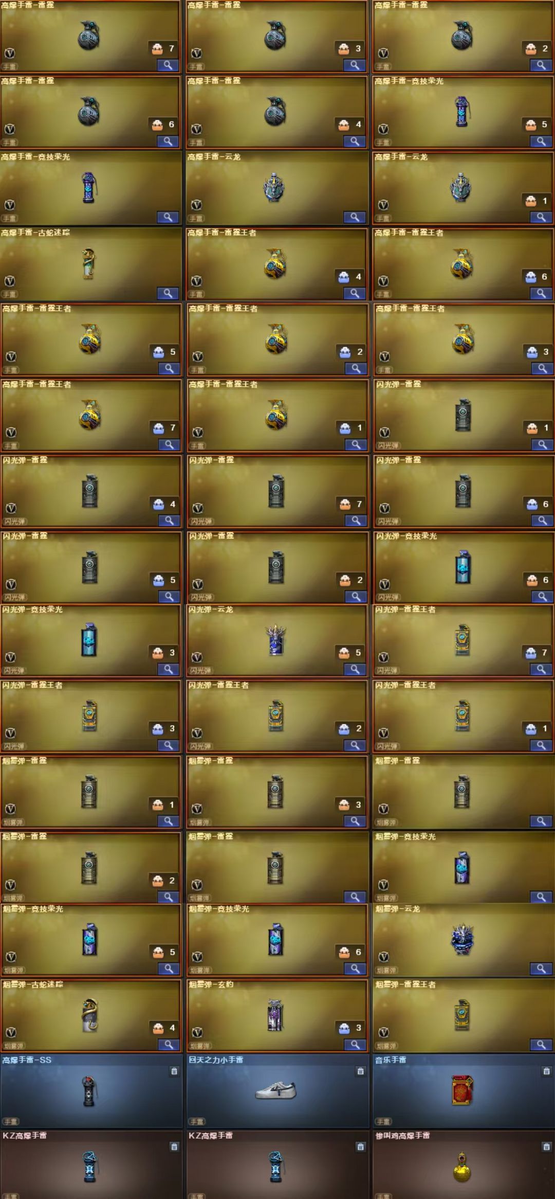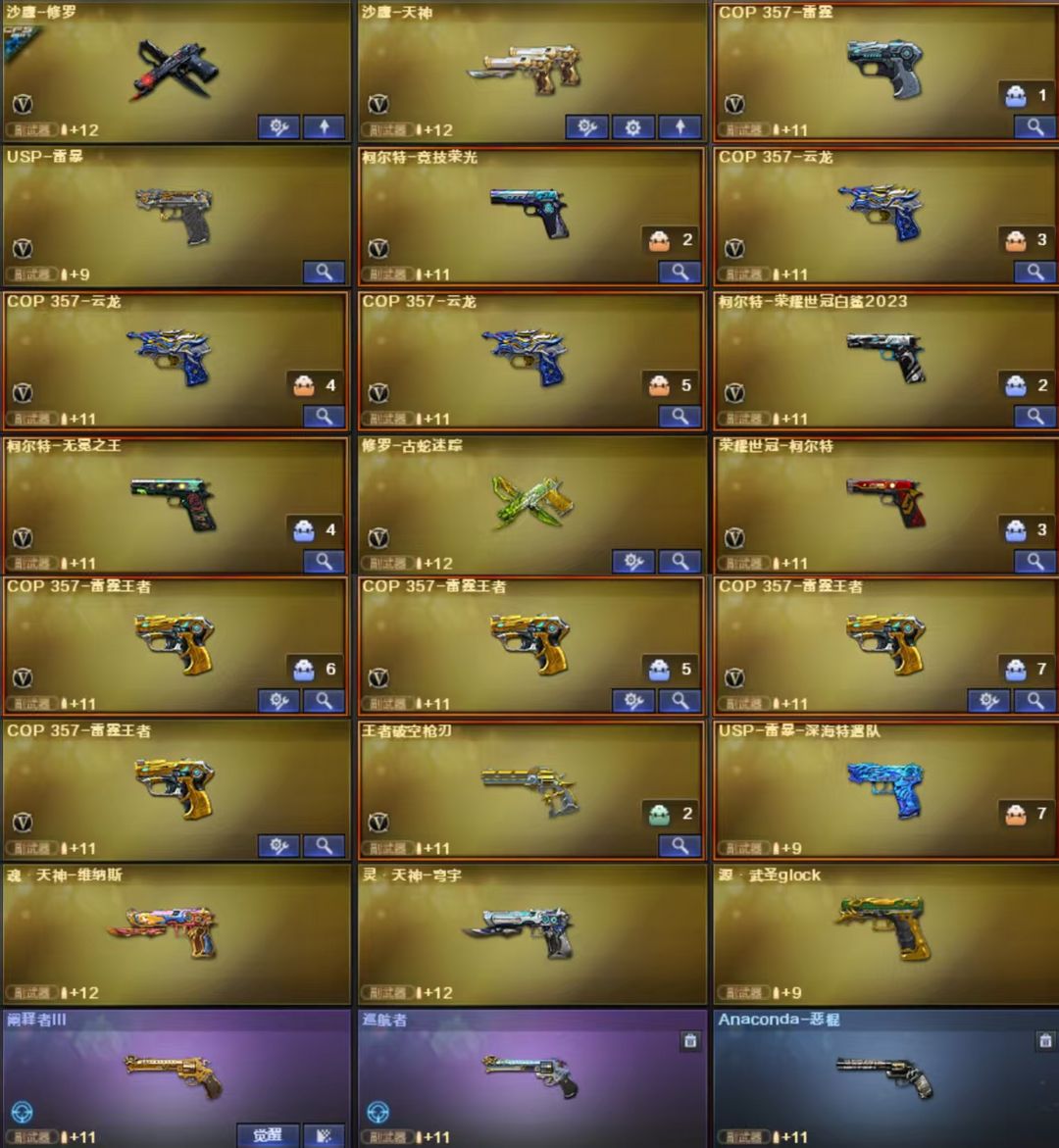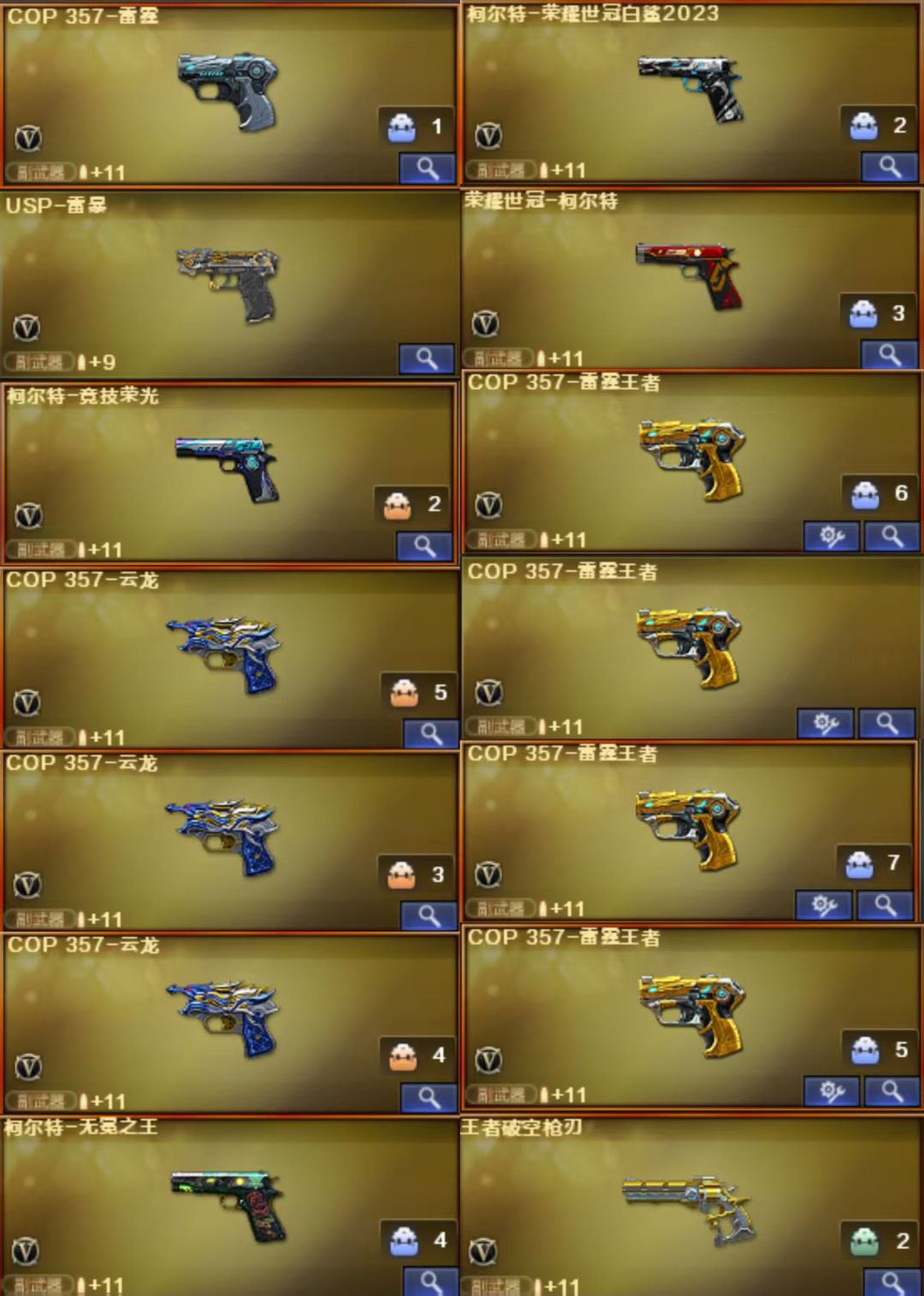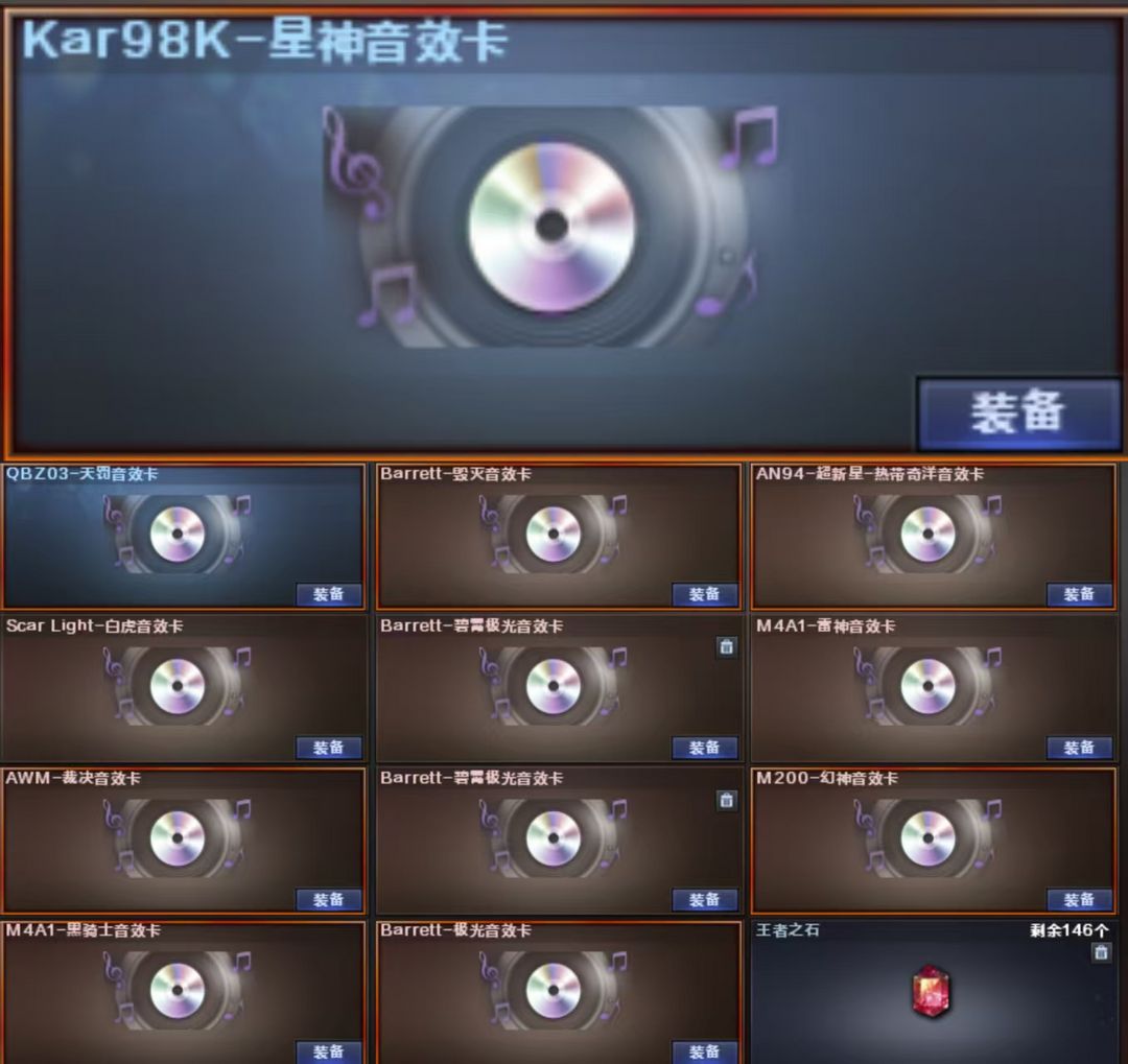 装备描述:王者武器:Barrett-雷霆王者-觉醒版;王者星光;王者之心-觉醒版;王者破空枪刃;COP 357-雷霆王者-觉醒版;QBZ-03-王者蔷薇-觉醒版;王者幻神-觉醒版;王者之魄-觉醒版;闪光弹-雷霆王者-觉醒版;高爆手雷-雷霆王者;雷霆王者之锋-觉醒版;烟雾弹-雷霆王者-觉醒版;王者之势-觉醒版;炫金千变;王者星霆;王者岩刺;炫金无影;王者之锋-觉醒版 英雄武器:Barrett-碧霄极光;麒麟刺;Kar98K-星神;QBZ03-天罚;M4A1-雷神;烟雾弹-玄豹;龙啸-烈火龙威;机械迷城-穹宇;M4A1-猎神;龙啸;屠龙;沙鹰-天神;AN94-超新星;G36C-幻影;柯尔特-荣耀世冠白鲨2023;M200-幻神;汤姆逊-烈龙;传说夜影;加特林-炼狱;RPK-盘龙;Kar98K-星神;传说幽瞳;M4A1-雷神;M4A1-黑骑士;柯尔特-无冕之王;荣耀世冠-雷神;荣耀世冠-火麒麟;荣耀世冠-柯尔特;AA-12-雷霆;M4A1-死神;擎天;AK12-天启;QBZ03-天罚;QBZ03-金色蔷薇;炽芒蝶刃;COP 357-云龙;高爆手雷-云龙;云龙扇;闪光弹-云龙;QBZ03-云龙;烟雾弹-
