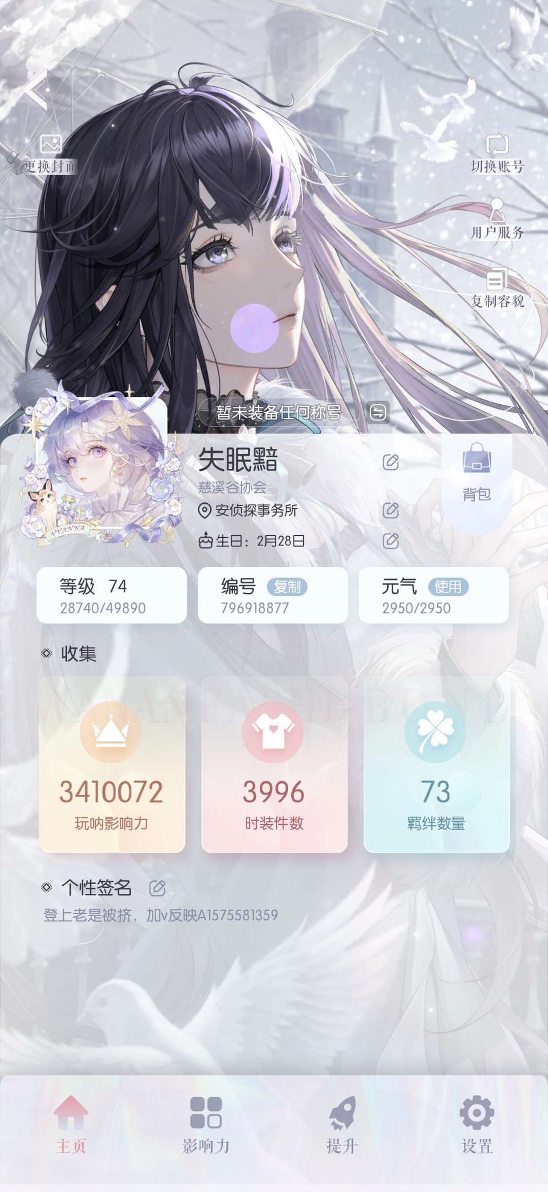 装备描述:【官服】安卓ios互通 ⚠️服务区认准:九尾熠世 可以自行解锁染色呀~ 【不顶号就不改密码滴哟】 ⚠️一定要看有图标的这个⚠️ ⚠️禁止毁号,此充值已超过立案金额,毁号注销必究 号主固定上号领任务时间:早上11:40或者19:20(会提前查看租号玩滴~ ⚠️不要删除穿搭笔记、玩呐,谢谢宝宝们 房子可以自主搭,大家也可以发布玩呐穿搭笔记,方便下次使用,我不会删除的,欢迎大家在评论区返图 ⚠️顶号我改密码⚠️ 大家要自觉哇~下过单又上号先查看租号玩,不然顶号反应我就改密码了,大家就得重新下单,被顶号的单主大大记得反应,希望大家互相理解,谢谢大家配合 ⚠️不要改协会呀谢谢宝宝们 ⚠️⚠️⚠️❣️❣️❣️租用过的再次上号一定要查看租号玩!没租出再上号!(划重点) 禁止利用账号进行开挂、使用辅助违规软件诈骗等违规操作。 请游戏局内保持文明,防止禁言影响他人游戏,祝您玩得愉快!