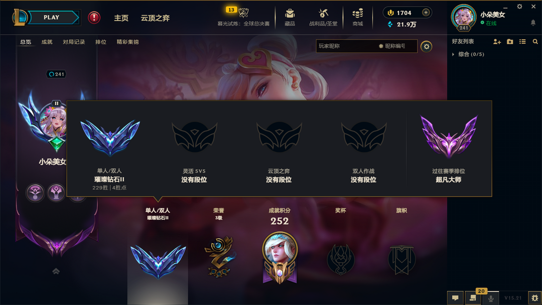 段位:241级 璀璨钻石II级 璀璨钻石II
