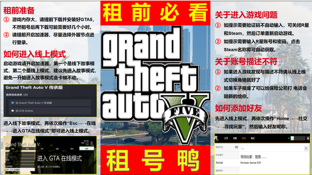 限制: 撤单率<25%才可租用此帐号装备描述:____⭐⭐⭐上号教程必须看 ⭐⭐⭐ ①如果提示输入验 证 码,直接关闭R星和Steam,订单重新启动游戏 ___⭐②如果提示输入R星账号和密码:点击Steam名称即可获取___ ⭐③进入游戏后先点击进入故事模式(避免直接进入在线模式卡在那) ___⭐ ④进入故事模式后按Esc键,再选择[在线] 然 后选择[进入GTA在线模式]选择需要进入的游戏战局就行___⭐⑤如果进入游戏发现与描述不符请从线上模式切换角铯就好了 ___⭐⑥ 如果车子报废了可以给保险公司打 电话会赔新的给你 ____________________________________________ ❤️喜欢本账号请点 ☆收 藏☆ 方便下次租用,谢谢光临惠顾❤️