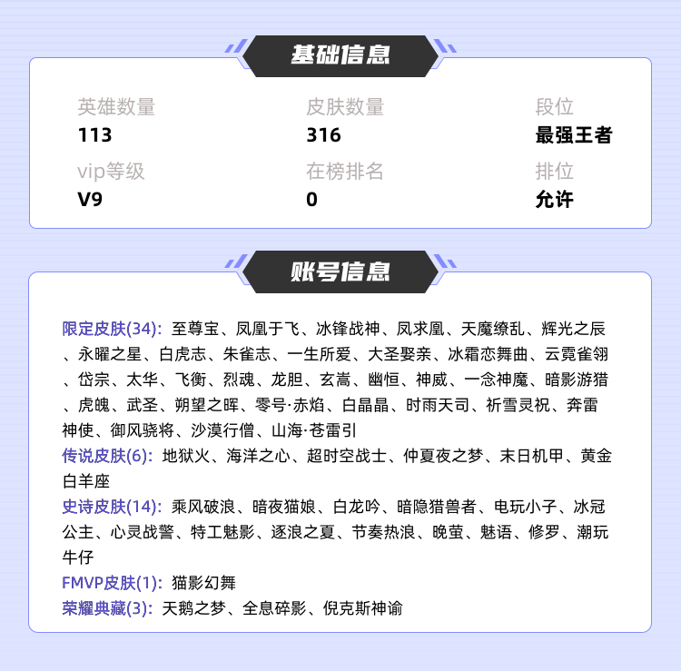 限制: 租号5次及以上 |装备描述:>>>>>>毁号,涉及毁坏虚拟财产罪及计算机安全罪,请文明游戏素质游戏,让我们共建美好租号平台>>>>>> 本游戏账号: ,英雄多,皮肤多。典藏皮肤3个,感受典藏皮肤带来的优质体验快感,FMVP皮肤1个,尽情享受FMVP皮肤带来的主角光环, 私人所属英雄皮肤有:孙悟空 全息碎影||武则天 倪克斯神谕||小乔 天鹅之梦狄仁杰 超时空战士||貂蝉 仲夏夜之梦||孙尚香 末日机甲||孙悟空 地狱火||武则天 海洋之心||张良 黄金白羊座,等等 注意事项: A.游戏过程中请不要恶意挂机或者不文明发言;B.恶意挂机、顶号等行为将被拉黑无法再次下单;C.进入游戏后中途请勿退出登陆,否则无法再次上号;D.部分账号由于异地登录可能会出现密码错误提示,通常再尝试5-6次后可上号。 |||||||||>喜欢本账号请点 ☆收藏☆ 方便下次租用,谢谢光临惠顾|||||||||