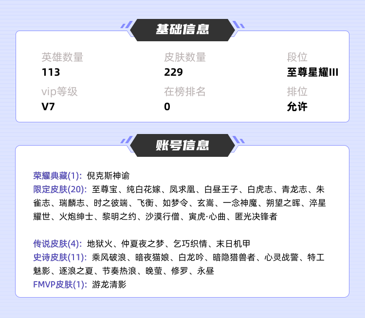 限制: 租号30次及以上 | 撤单率<75%才可租用此帐号装备描述:>>>>>>毁号,涉及毁坏虚拟财产罪及计算机安全罪,请文明游戏素质游戏,让我们共建美好租号平台>>>>>> 本游戏账号: ,英雄多,皮肤多。典藏皮肤1个,感受典藏皮肤带来的优质体验快感,FMVP皮肤1个,尽情享受FMVP皮肤带来的主角光环, 私人所属英雄皮肤有:武则天 倪克斯神谕貂蝉 仲夏夜之梦||孙悟空 地狱火||王昭君 乞巧织情||孙策 末日机甲西施 游龙清影百里守约 朱雀志||百里玄策 白虎志||达摩 沙漠行僧||妲己 时之彼端||韩信 飞衡||花木兰 瑞麟志||黄忠 火炮绅士||铠 青龙志||李白 凤求凰||女娲 朔望之晖||孙悟空 至尊宝||夏侯惇 匿光决锋者||小乔 纯白花嫁||雅典娜 黎明之约||杨玉环 寅虎·心曲||嬴政 白昼王子||赵云 淬星耀世||庄周 玄嵩||李信 一念神魔||嫦娥 如梦令,等等 注意事项: A.游戏过程中请不要恶意挂机或者不文明发言;B.恶意挂机、顶号等行为将被拉黑无法再次下单;C.进入游戏后中途请勿退出登陆,否则无法再次上号;D.部分账号由于异地登录可能会出现密码错误提示,通常再尝试5-6次后可上号。 开挂必定追究到底!!!