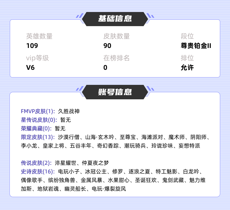装备描述:>>>>>>毁号,涉及毁坏虚拟财产罪及计算机安全罪,请文明游戏素质游戏,让我们共建美好租号平台>>>>>> 本游戏账号: V6用户,基础段位:尊贵铂金I,英雄虽然少,应该有你喜欢的英雄。,皮肤目前不多,希望有你喜欢的。FMVP皮肤1个,尽情享受FMVP皮肤带来的主角光环, 私人所属英雄皮肤有:貂蝉 仲夏夜之梦||赵云 淬星耀世干将莫邪 久胜战神孙悟空 至尊宝||裴擒虎 李小龙||马可波罗 山海·玄木吟百里守约 特工魅影||李元芳 逐浪之夏||鲁班七号 电玩小子||韩信 白龙吟,等等 注意事项: A.游戏过程中请不要恶意挂机或者不文明发言;B.恶意挂机、顶号等行为将被拉黑无法再次下单;C.进入游戏后中途请勿退出登陆,否则无法再次上号;D.部分账号由于异地登录可能会出现密码错误提示,通常再尝试5-6次后可上号。 |||||||||>喜欢本账号请点 ☆收藏☆ 方便下次租用,谢谢光临惠顾|||||||||