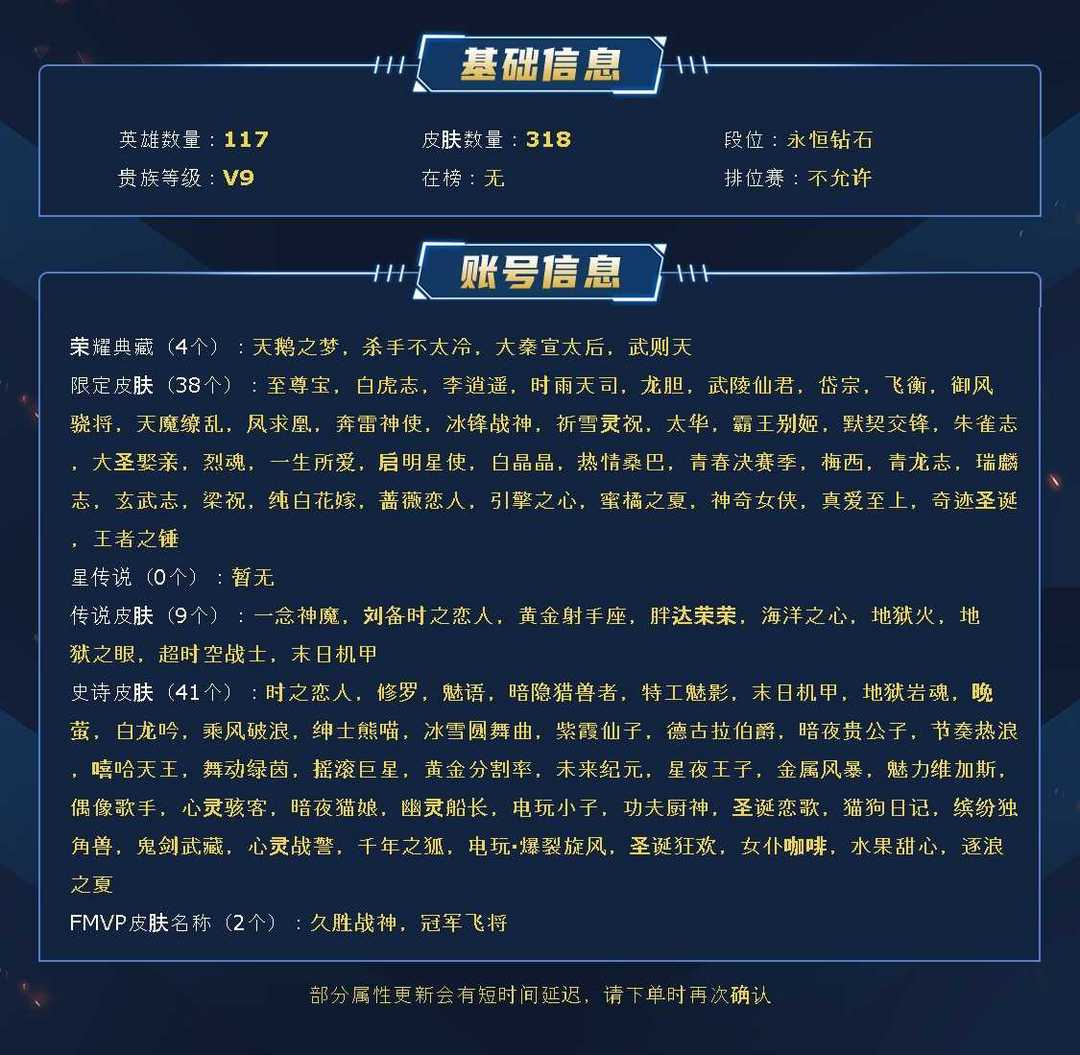 限制: 租号30次及以上 |装备描述:>>>>>>毁号,涉及毁坏虚拟财产罪及计算机安全罪,请文明游戏素质游戏,让我们共建美好租号平台>>>>>> 本游戏账号: V10用户,基础段位:尊贵铂金II,英雄多,皮肤多。典藏皮肤3个,感受典藏皮肤带来的优质体验快感,FMVP皮肤2个,尽情享受FMVP皮肤带来的主角光环, 私人所属英雄皮肤有:孙尚香 杀手不太冷||芈月 大秦宣太后||小乔 天鹅之梦诸葛亮 时雨天司||诸葛亮 武陵仙君||梦奇 胖达荣荣||孙尚香 末日机甲||公孙离 祈雪灵祝||吕布 天魔缭乱||曜 李逍遥||宫本武藏 地狱之眼||李白 凤求凰||狄仁杰 超时空战士||武则天 海洋之心||兰陵王 默契交锋||艾琳 觅芳踪||孙悟空 地狱火||后羿 黄金射手座||虞姬 启明星使||杨戬 永曜之星||李信 一念神魔||伽罗 太华,等等 注意事项: A.游戏过程中请不要恶意挂机或者不文明发言;B.恶意挂机、顶号等行为将被拉黑无法再次下单;C.进入游戏后中途请勿退出登陆,否则无法再次上号;D.部分账号由于异地登录可能会出现密码错误提示,通常再尝试5-6次后可上号。 |||||||||>喜欢本账号请点 ☆收藏☆ 方便下次租用,谢
