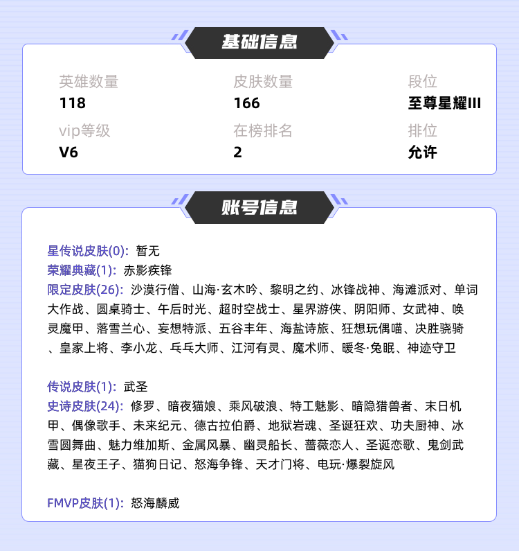 限制: 租号30次及以上 |装备描述:>>>>>>毁号,涉及毁坏虚拟财产罪及计算机安全罪,请文明游戏素质游戏,让我们共建美好租号平台>>>>>> 本游戏账号: V7用户,基础段位:荣耀王者56星,英雄多,皮肤多。典藏皮肤1个,感受典藏皮肤带来的优质体验快感,FMVP皮肤2个,尽情享受FMVP皮肤带来的主角光环, 私人所属英雄皮肤有:关羽 赤影疾锋关羽 武圣吕布 怒海麟威关羽 决胜骁骑‖镜 炽阳神光‖宫本武藏 地狱之眼||盾山 圆桌骑士||阿古朵 江河有灵||艾琳 女武神||李元芳 妄想特派||暃 星界游侠||嫦娥 暖冬·兔眠||狄仁杰 魔术师||马可波罗 山海·玄木吟||桑启 海盐诗旅||钟无艳 超时空战士||鬼谷子 五谷丰年||甄姬 落雪兰心||王昭君 午后时光||雅典娜 黎明之约||刘禅 唤灵魔甲||达摩 沙漠行僧||赵云 皇家上将||鲁班大师 乓乓大师||墨子 神迹守卫||关羽 冰锋战神||狄仁杰 阴阳师||项羽 海滩派对||蒙犽 狂想玩偶喵等等 注意事项: A.游戏过程中请不要恶意挂机或者不文明发言;B.恶意挂机、顶号等行为将被拉黑无法再次下单;C.进入游戏后中途请勿退出登陆,否则无法再次上号;D.部分账号