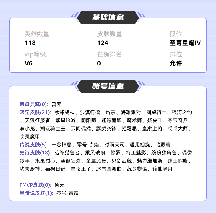 装备描述:>>>>>>毁号,涉及毁坏虚拟财产罪及计算机安全罪,请文明游戏素质游戏,让我们共建美好租号平台>>>>>> 本游戏账号: ,英雄多,皮肤多。 私人所属英雄皮肤有:诸葛亮 时雨天司||孙悟空 零号·赤焰||桑启 鸣野蒿||貂蝉 遇见胡旋||李信 一念神魔李元芳 银河之约||明世隐 疑决卦||嫦娥 拒霜思||狄仁杰 魔术师||狄仁杰 阴阳师||刘邦 夺宝奇兵||典韦 岱宗||花木兰 默契交锋||元歌 云间偶戏||刘禅 唤灵魔甲||项羽 海滩派对||蔡文姬 繁星吟游||赵云 皇家上将||曹操 天狼征服者||裴擒虎 李小龙||盾山 圆桌骑士||亚瑟 潮玩骑士王||鲁班大师 乓乓大师||达摩 沙漠行僧||关羽 冰锋战神||阿轲 迷踪丽影,等等 注意事项: A.游戏过程中请不要恶意挂机或者不文明发言;B.恶意挂机、顶号等行为将被拉黑无法再次下单;C.进入游戏后中途请勿退出登陆,否则无法再次上号;D.部分账号由于异地登录可能会出现密码错误提示,通常再尝试5-6次后可上号。 |||||||||>喜欢本账号请点 ☆收藏☆ 方便下次租用,谢谢光临惠顾|||||||||