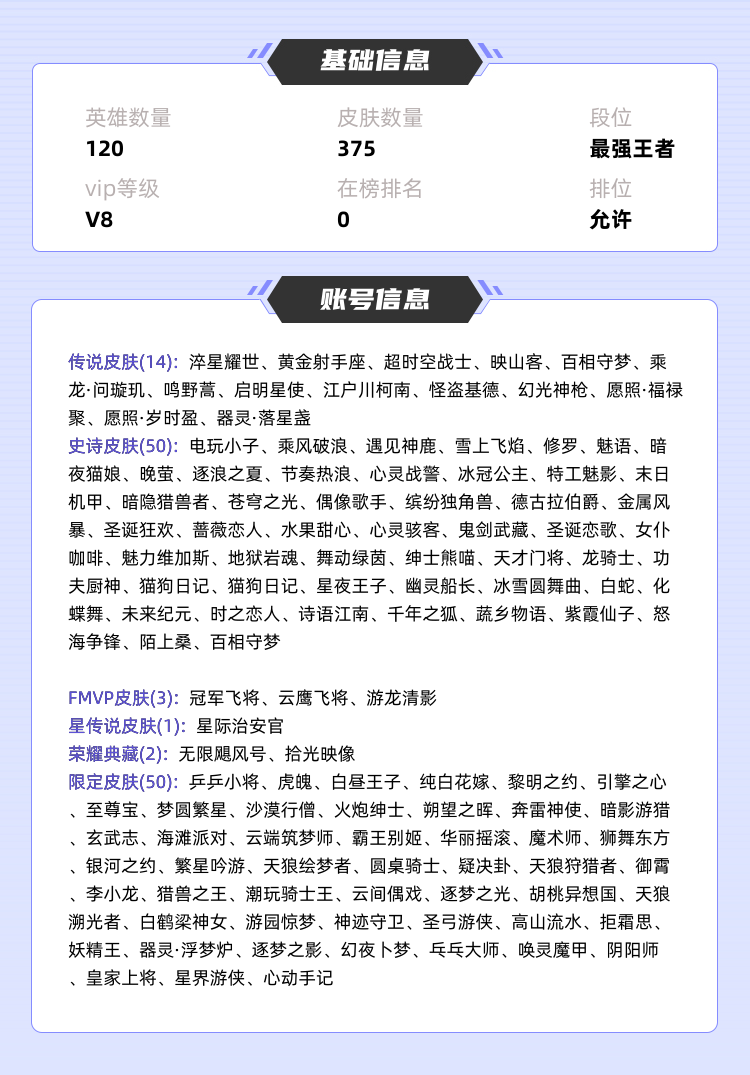 限制: 租号10次及以上 |装备描述:>>>>>>毁号,涉及毁坏虚拟财产罪及计算机安全罪,请文明游戏素质游戏,让我们共建美好租号平台>>>>>> 本游戏账号: ,英雄多,皮肤多。典藏皮肤2个,感受典藏皮肤带来的优质体验快感,FMVP皮肤3个,尽情享受FMVP皮肤带来的主角光环, 私人所属英雄皮肤有:夏侯惇 无限飓风号||瑶 拾光映像虞姬 启明星使||张飞 百相守梦||赵云 淬星耀世||鲁班七号 江户川柯南||云缨 幻光神枪||马可波罗 怪盗基德||孙尚香 乘龙·问璇玑||桑启 鸣野蒿||嫦娥 器灵·落星盏||狄仁杰 超时空战士||王昭君 映山客||后羿 黄金射手座,等等 注意事项: A.游戏过程中请不要恶意挂机或者不文明发言;B.恶意挂机、顶号等行为将被拉黑无法再次下单;C.进入游戏后中途请勿退出登陆,否则无法再次上号;D.部分账号由于异地登录可能会出现密码错误提示,通常再尝试5-6次后可上号。 |||||||||>喜欢本账号请点 ☆收藏☆ 方便下次租用,谢谢光临惠顾|||||||||