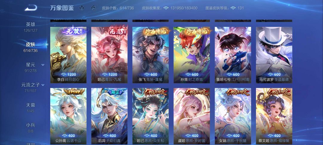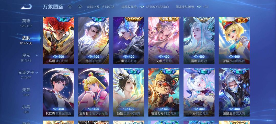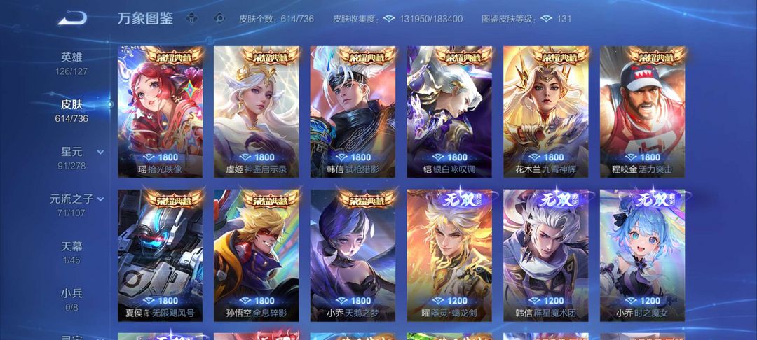 各种传说皮肤还有典藏皮肤 无双贵10/ 614个皮肤/超值的 快来体验
