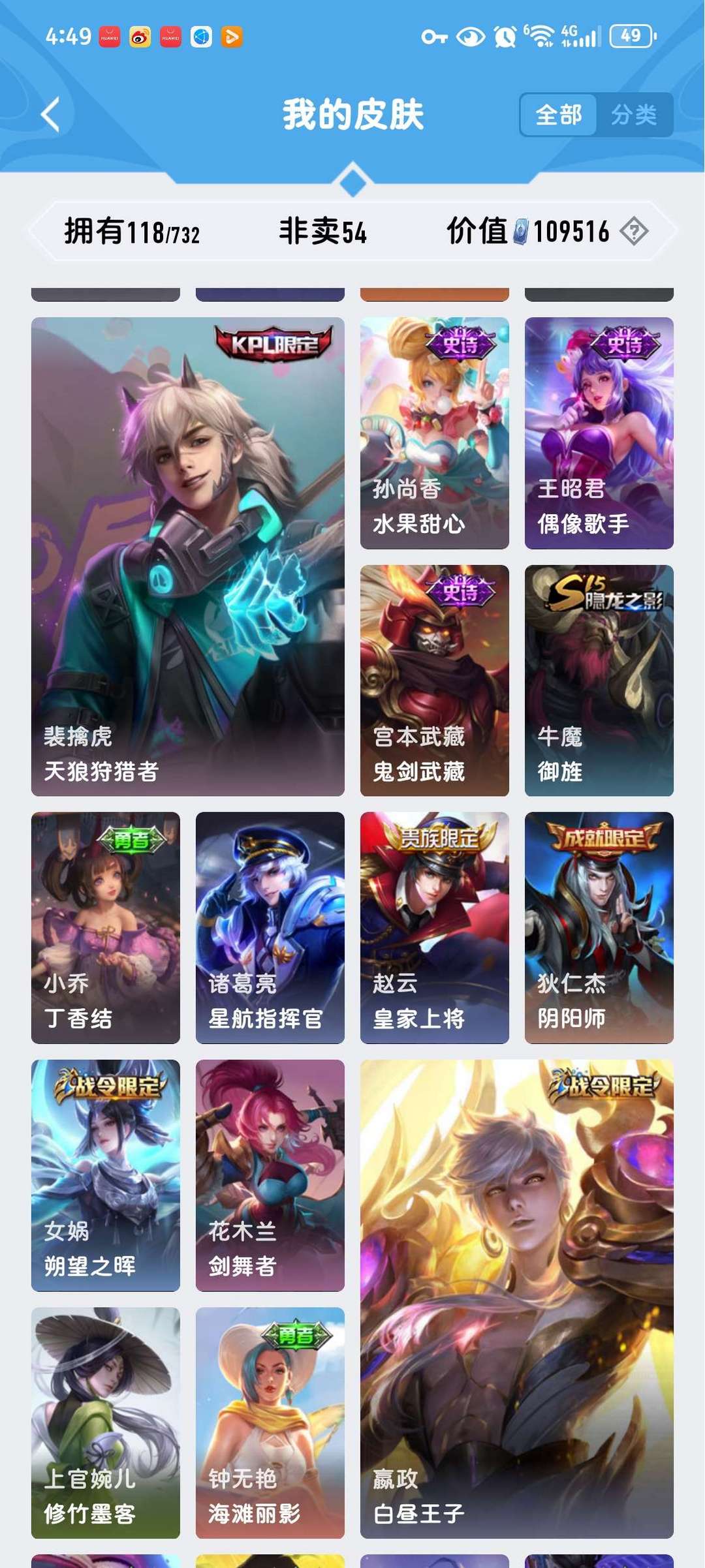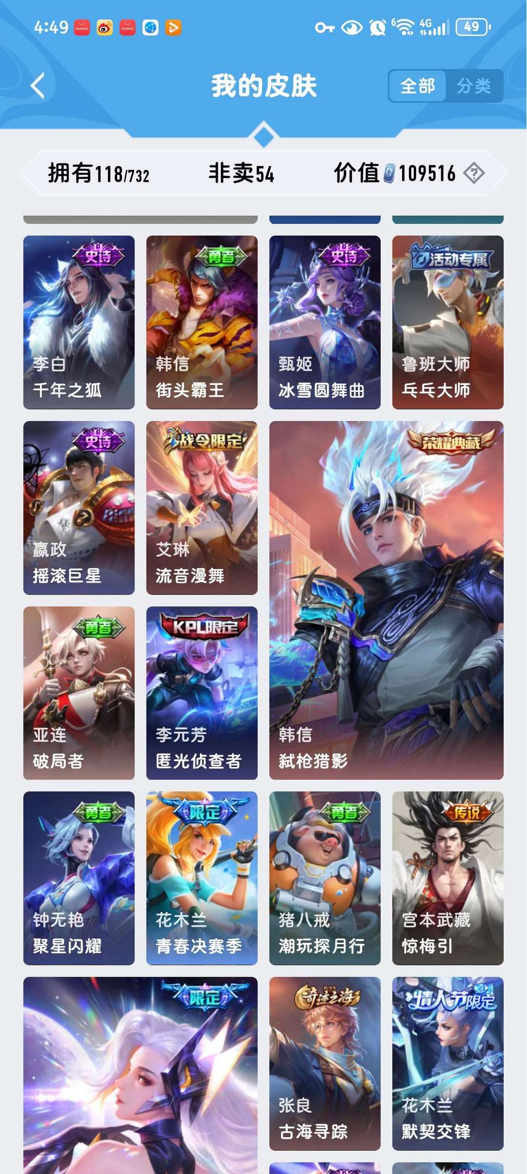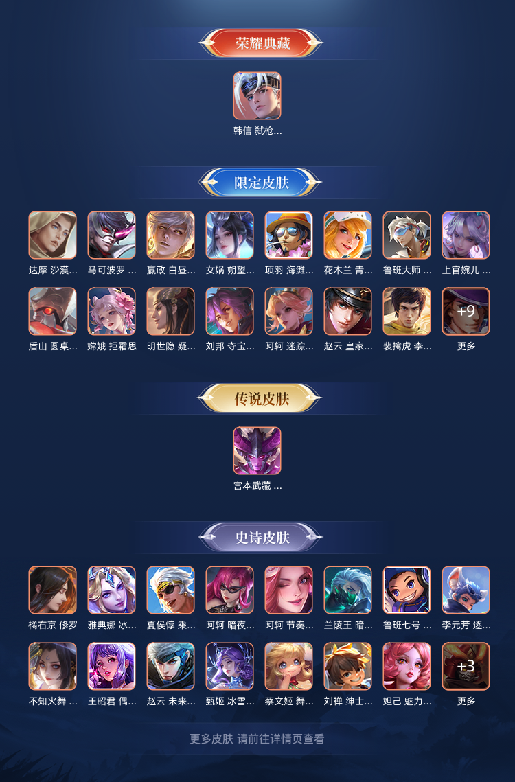众多精美皮肤,限定皮肤 荣耀典藏韩信等