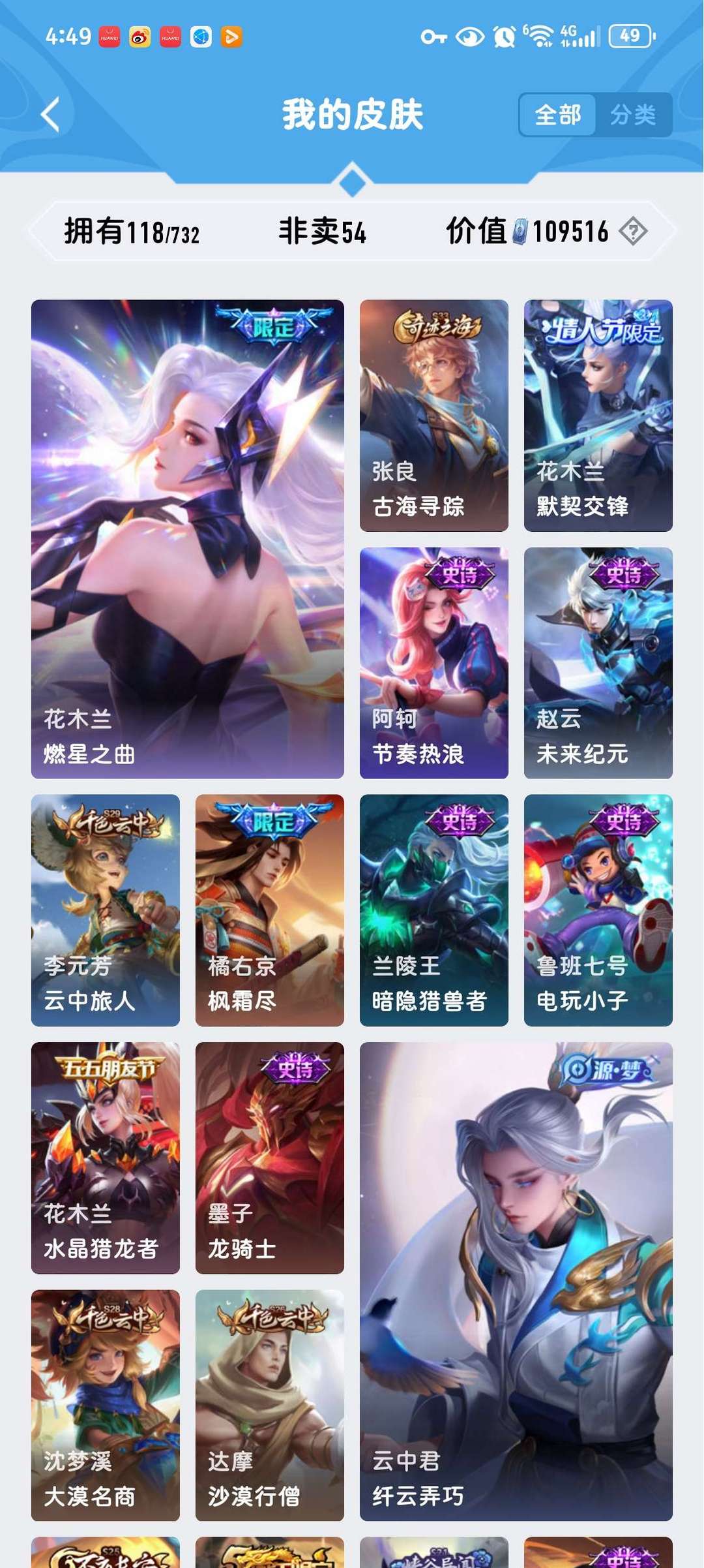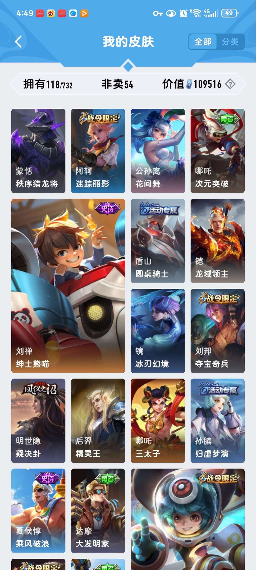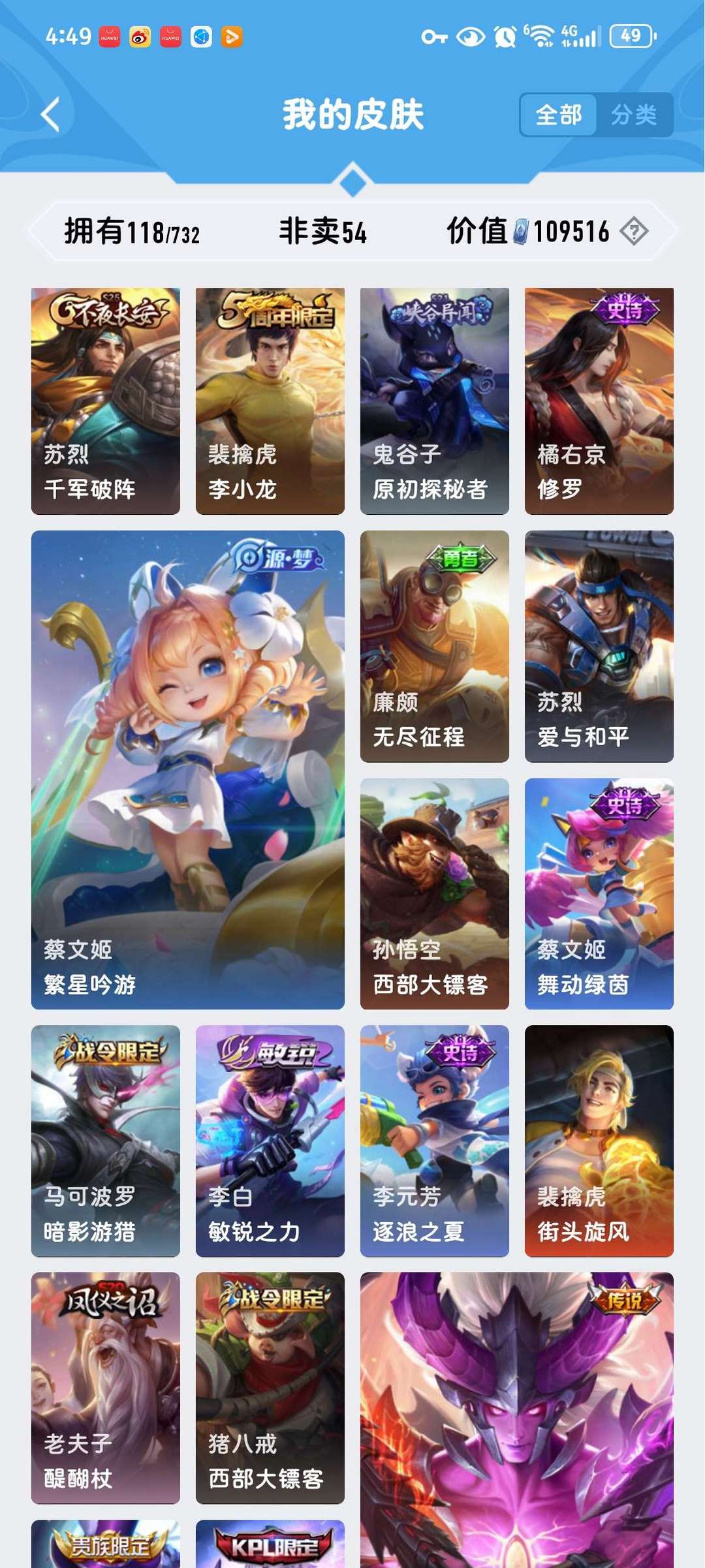 众多精美皮肤,限定皮肤 荣耀典藏韩信等