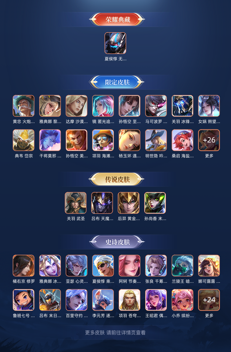 288皮肤/夏侯惇无线飓风号/关羽武圣/孙尚香末日机甲/吕布天魔缭乱/后羿黄金射手/西施游龙清影