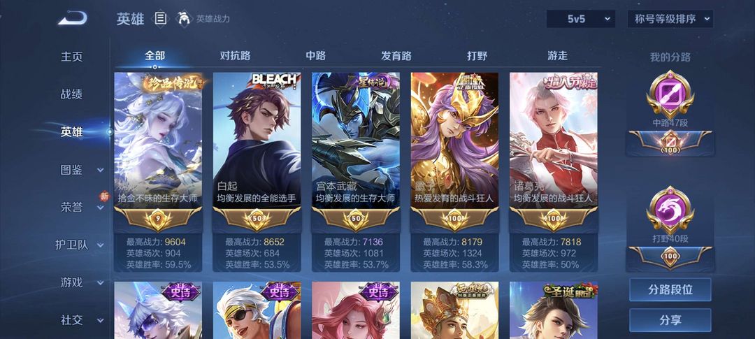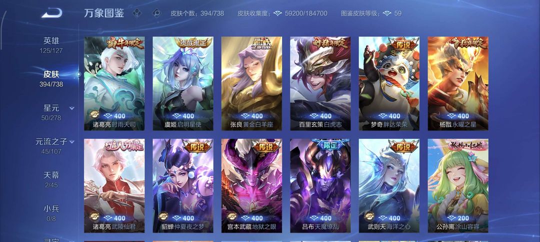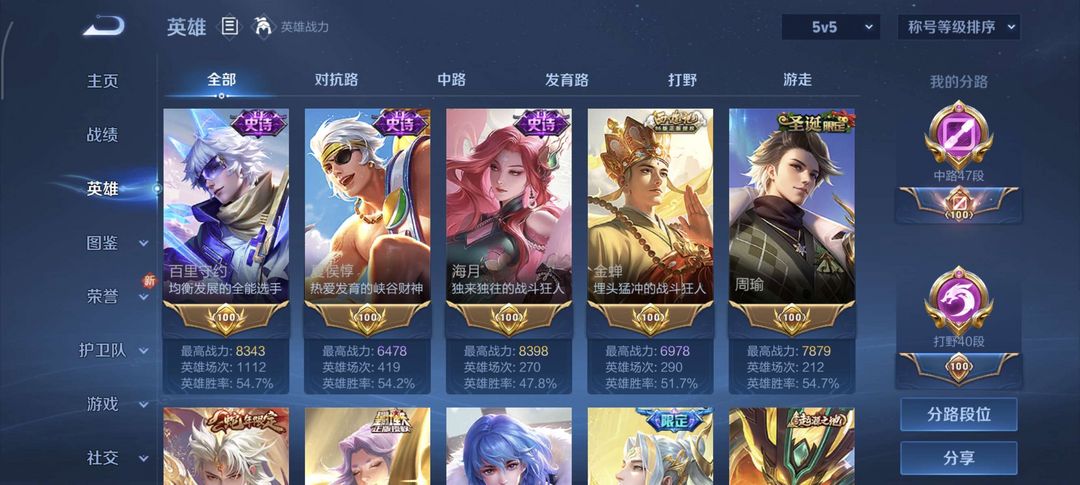 v9,47段中路+40段打野,394皮肤,19传说1珍品限定,历史省9嫦娥,省百诸葛亮,墨子,海月等
