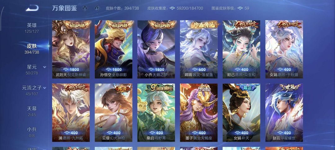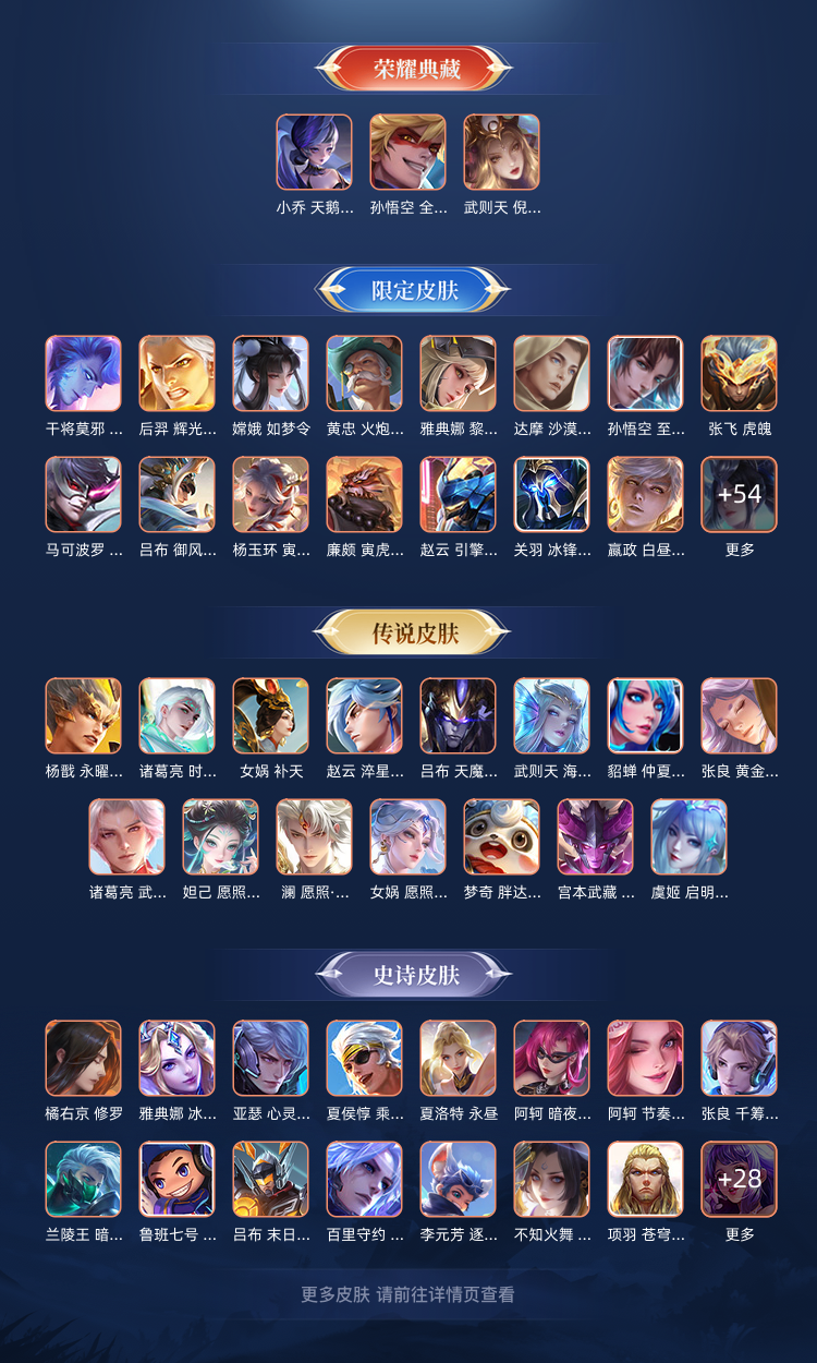装备描述:47段中路+44段打野,394皮肤,4荣耀典藏,19传说1珍品限定,历史省9嫦娥,省17宫本,省百诸葛亮,墨子,海月,金蝉,周瑜,夏侯惇,