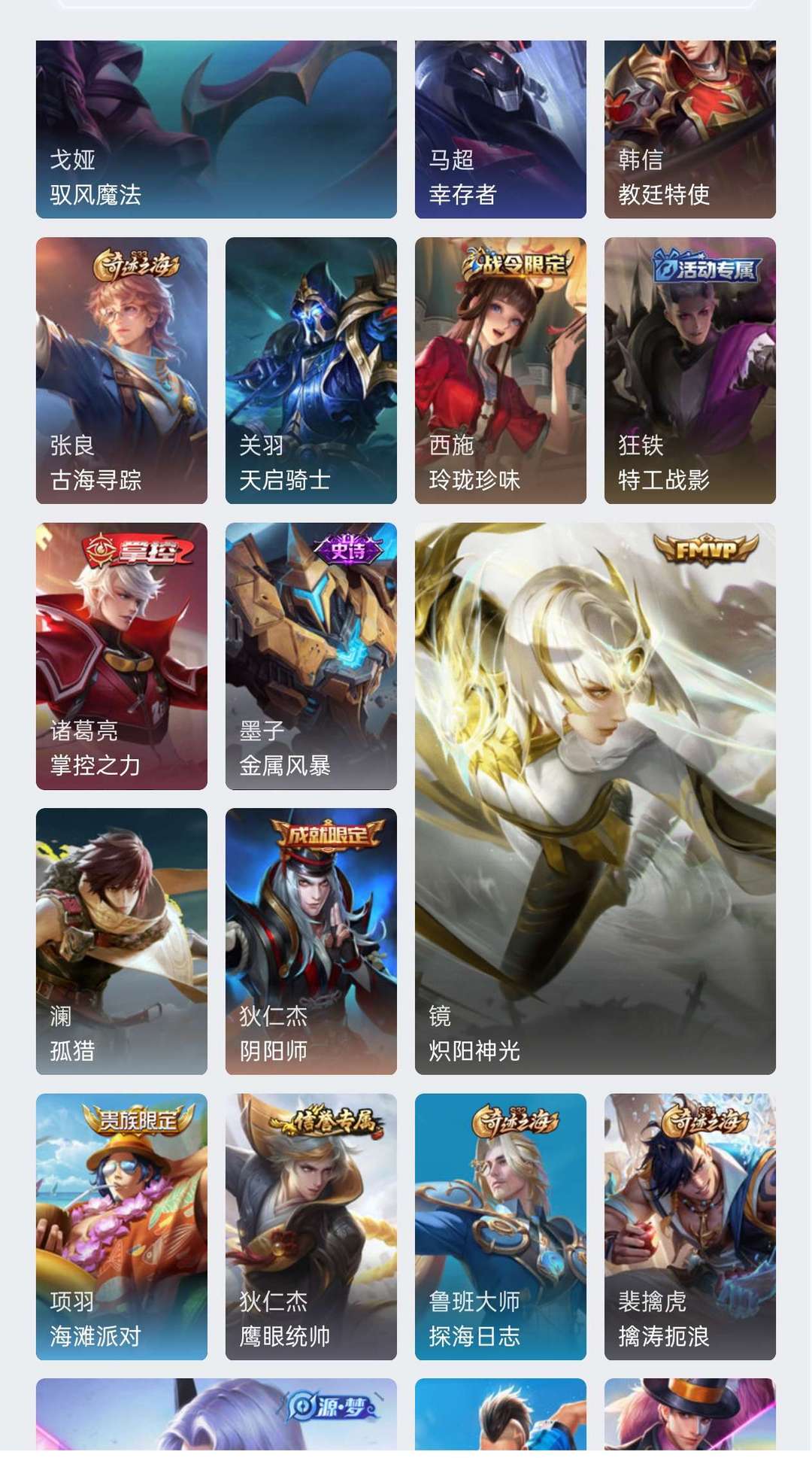 至尊宝,飞衡,朱雀志,炽阳神光,地狱之眼,末日机甲,零号赤焰,紫霞仙子,女武神,街头霸王,白龙吟