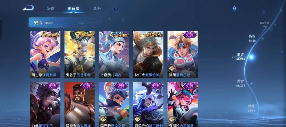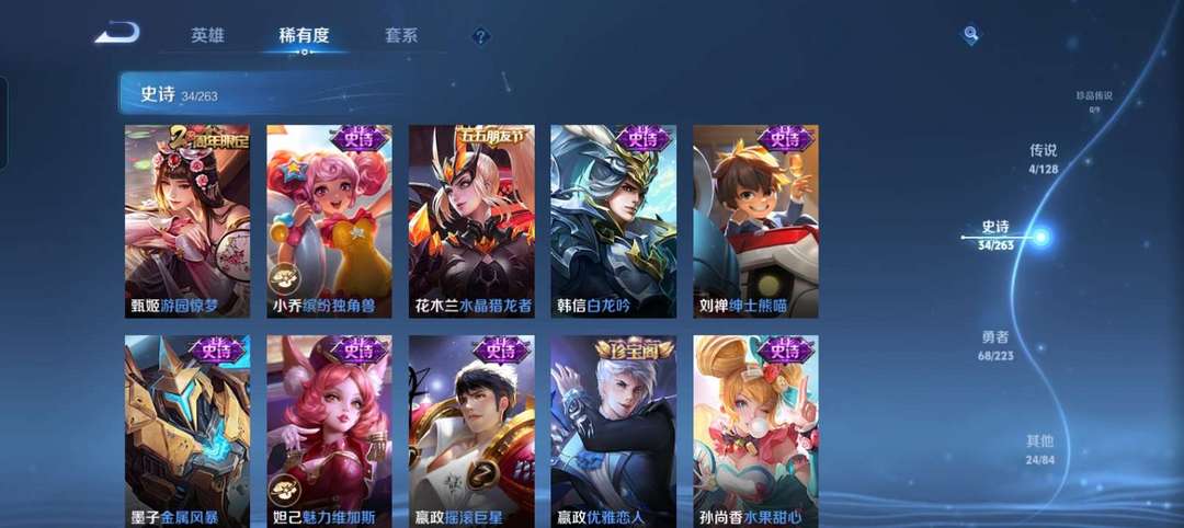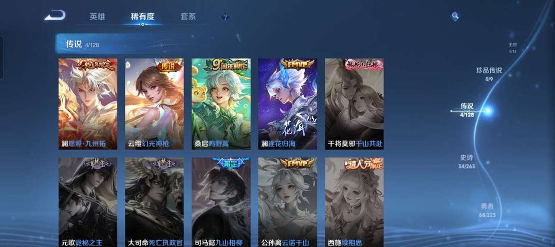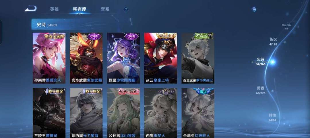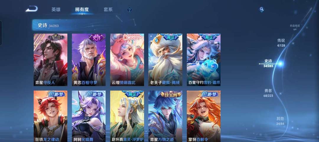 星耀二 124个英雄 130个皮肤 澜的逐花归海等传说皮肤和很多史诗 全铭文