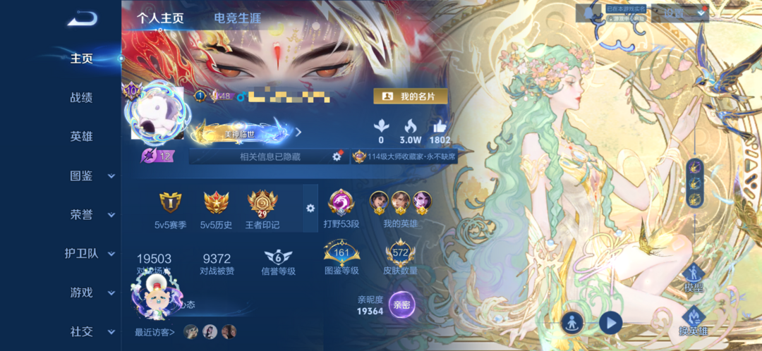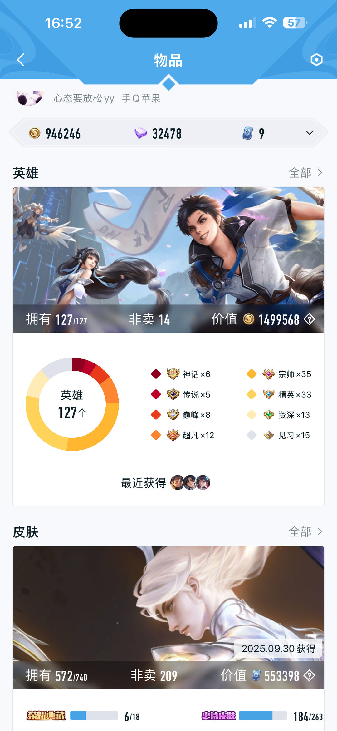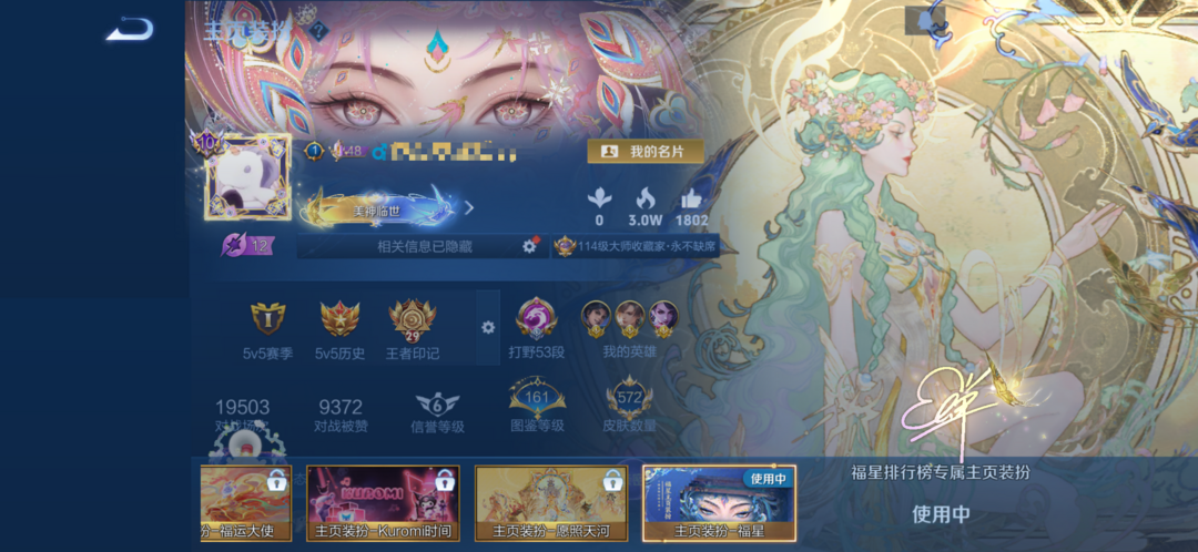 装备描述:貂蝉慕夏无双全套+全屏天幕+凯/诸葛/李白/耀/韩信/蛇年福星排行榜省级前一千动态头像框+年限眨眼主页装扮+福星拖尾+福星名片+用玉桂狗小兵+53段打野,打野英雄基本都是全皮!带妹专属!!