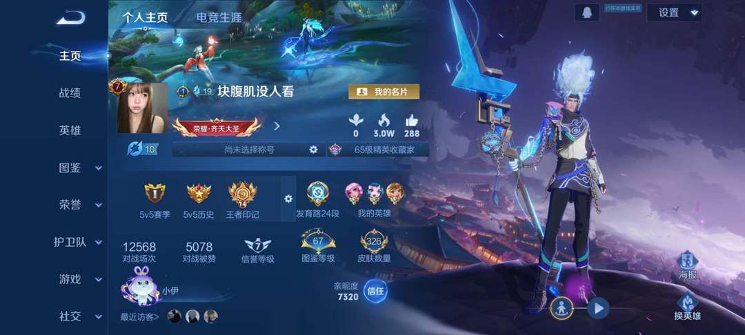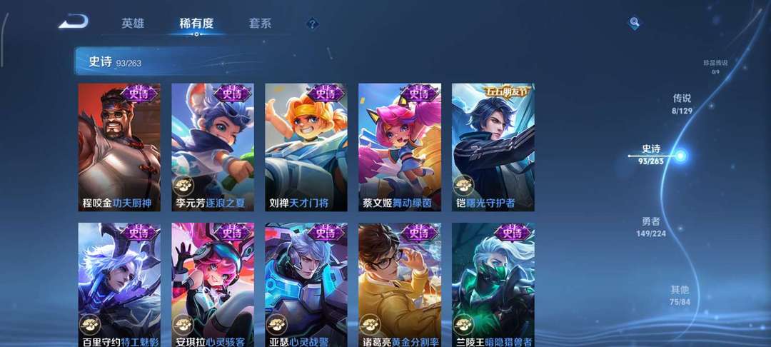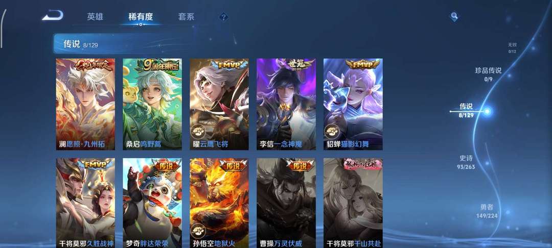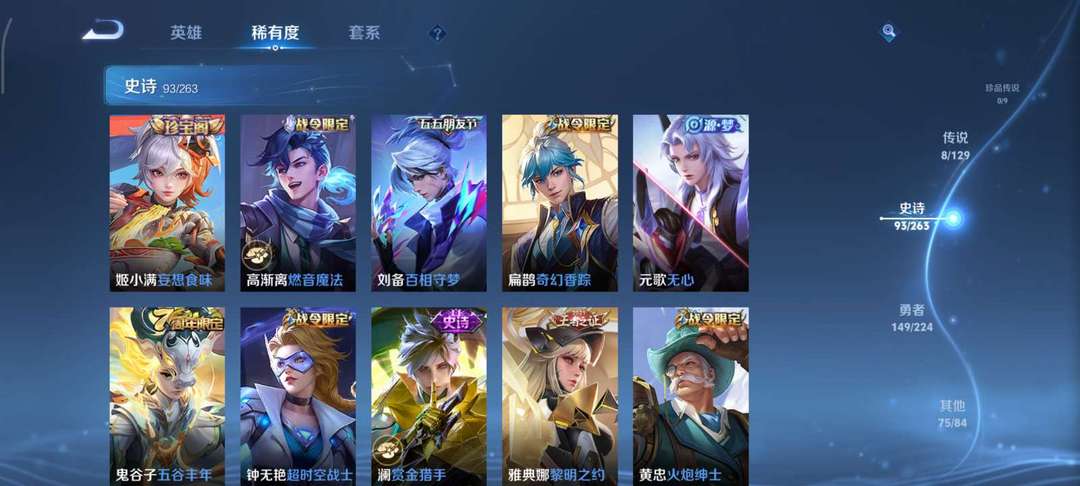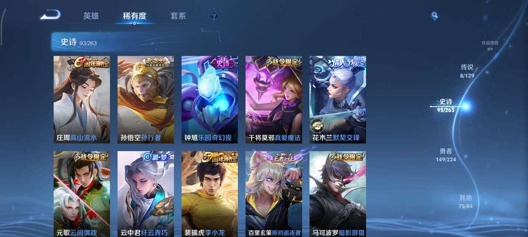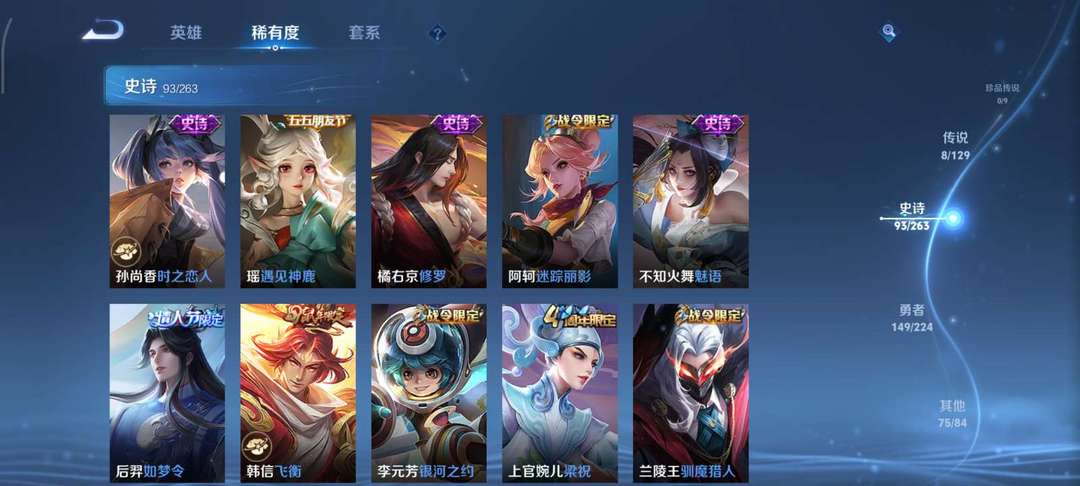 326皮肤 8传说 93史诗 韩信荣耀典藏 102限定 100信誉积分 满套铭文 目前星耀一