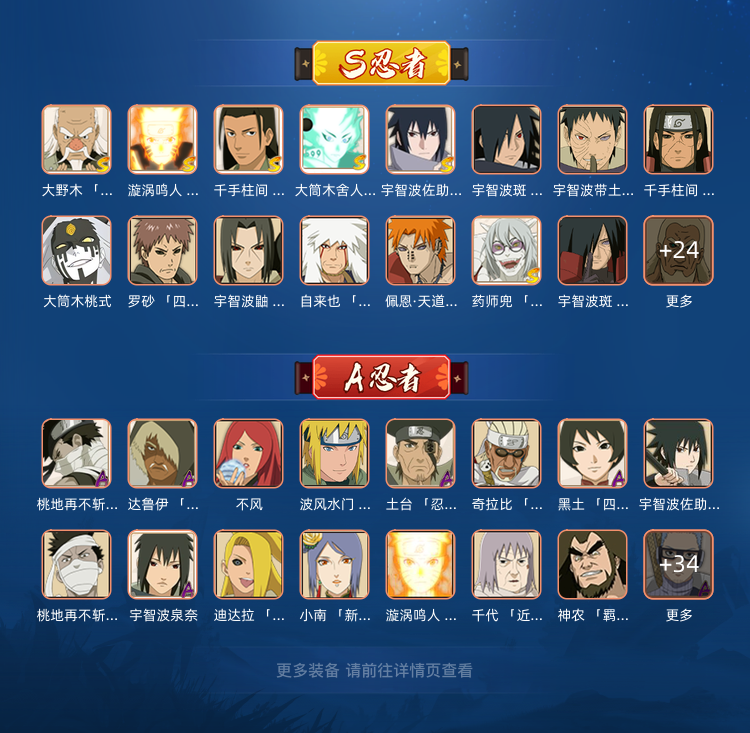 装备描述:S忍者(部分) 金身水门/三忍自来也/天道超/白面具/死斑/死柱间/仙兜/死鼬/半藏/死门凯/死二/破面带土/长门(详情见图) A忍者(部分) 秽土再不斩/漂泊/再不斩/新春小南/漂泊小南/神农/秽土角都/金鸣/忍战我爱罗/博人传黑土/忍战奇拉比/蛇兜/死迪/青水(详情见图) #禁止利用账号进行开挂、使用辅助违规软件诈骗等违规操作。