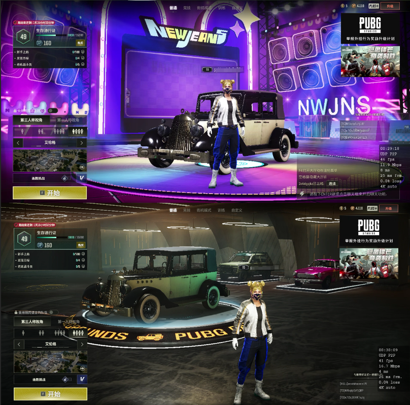 装备描述:老爷车/炫酷女团大厅【二成长型✌3级异色恶魔ACE32✌妖魔之触ACE32】2019夹克✌暗夜女郎套装✌帝皇套✌牛魔王套✌芭蕉扇✌霓虹之星✌SCAR✌L✌柠檬汁M416✌无信号S12K✌粉梦M24✌无慈悲K2✌宝石M762✌无慈悲98K