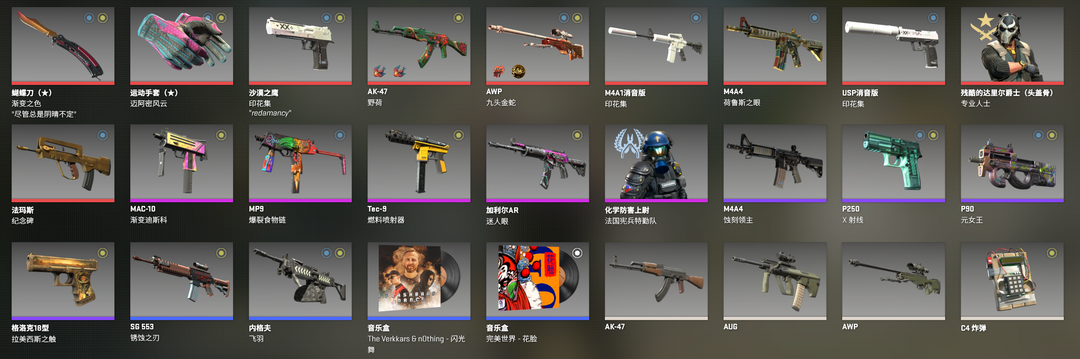 可老兵完美/5e/野荷AK/渐变蝴蝶刀/迈阿密手套/九头蛇狙/荷鲁斯m4/印花集套