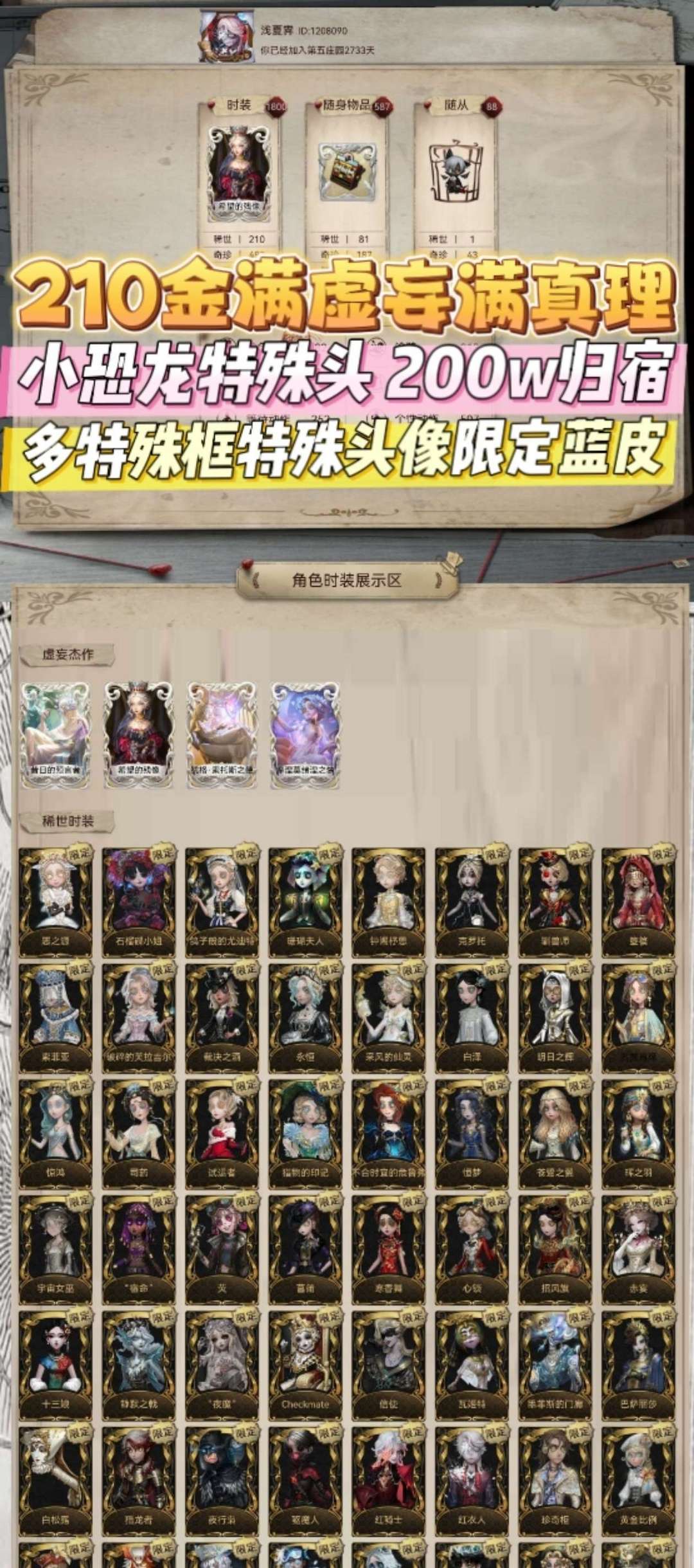 装备描述:【满氪满真理满虚妄】真理之下满配320金超大情恶之源克罗托珊静默赤宴文明游戏不要禁言哦,号已在pcs备案,如若账号出现开挂问题将追究法律责任。可共享极品号,没安装官服的不要租不要以没下载官服为撤单理由!核实画质正常卡是因为设备原因不要以此原因撤单要不然拉黑处理!畅玩不存在顶号如果遇到顶号就在个人中心的设备管理中取消上一个设备的授权这样就不会被顶号了。最重要的一点:此号已经备案,通过不正当手段开通第三方工具导致封号的和毁号的,直接上报公安局抓人,不要以为你在网络上就抓不到你,网络不是法外之地此号价值远超立案标准,切勿以身试法!!!最后喜欢给个好评吧感谢支持!!!有什么问题都可以评论,每条我都会回复的!!!