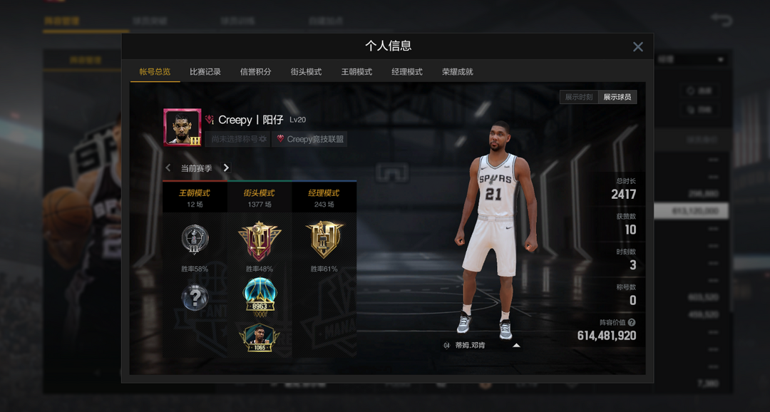⭐可排位,段位:超巨⭐满突04邓肯,最新陈列室,历史第一大前锋⭐全能邓肯攻防一体⭐